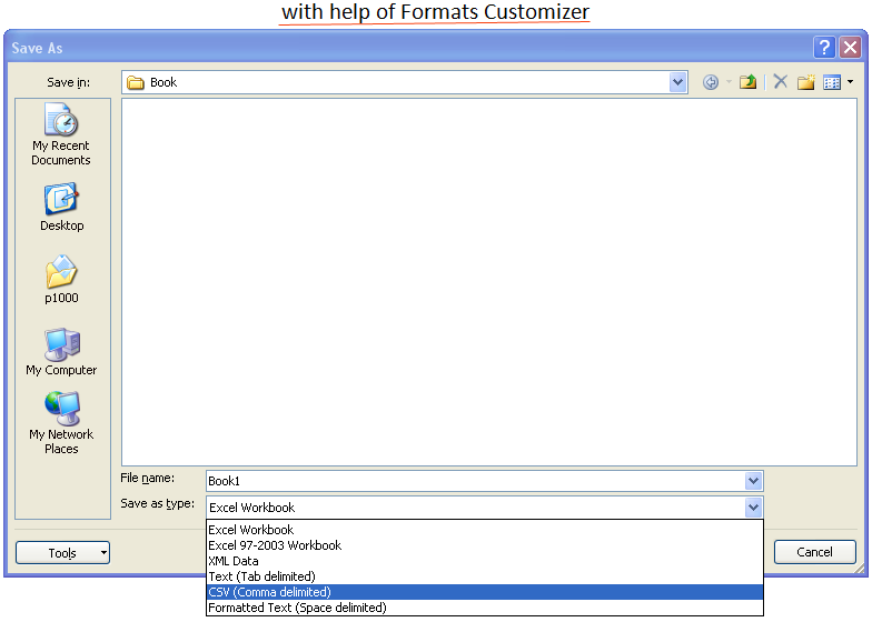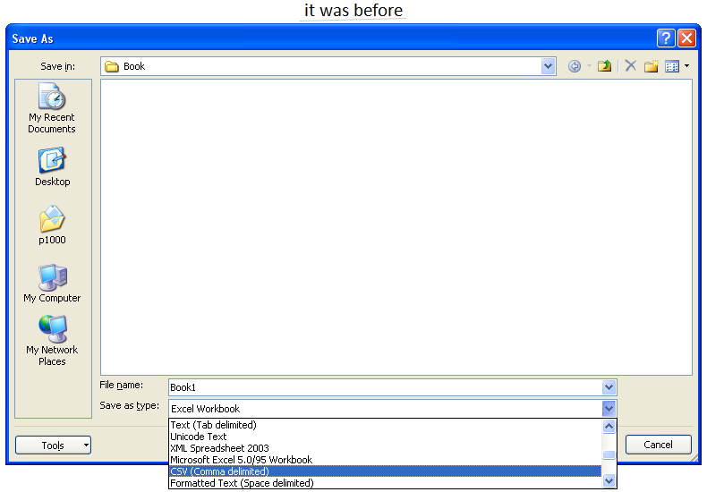 Microsoft Office Excel. Диалоговое окно сохранения. Windows XP