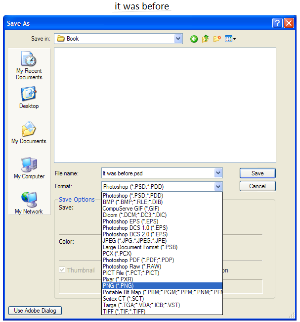 Adobe Photoshop. Диалоговое окно сохранения файлов. Windows XP