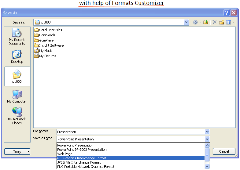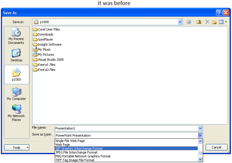 Microsoft Office PowerPoint. Диалоговое окно сохранения. Windows XP